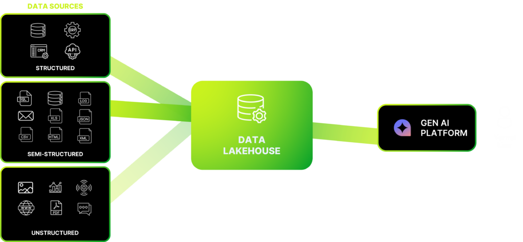 Integrating diverse data sources—structured, semi-structured, and unstructured—into a unified Data Lakehouse. This integration centralizes data for analytics but still requires advanced teams such as IT, Machine Learning (ML), and Data Science to process and extract insights effectively.